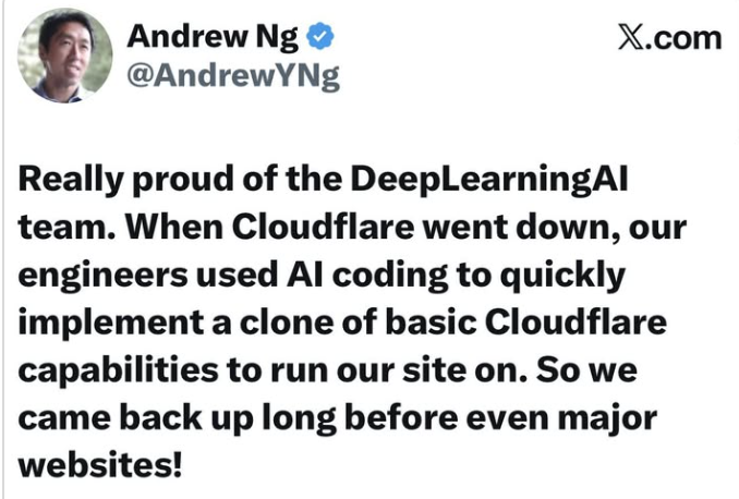 在這個時間點,Andrew Ng 說他的網站工程師利用 AI Coding 很快速的搭建一個 CloudFlare bare minimal 的備援組件,讓他挺過了這個 outage。