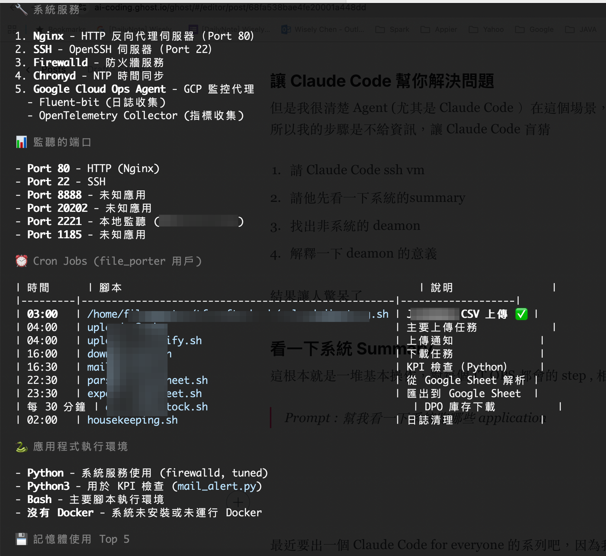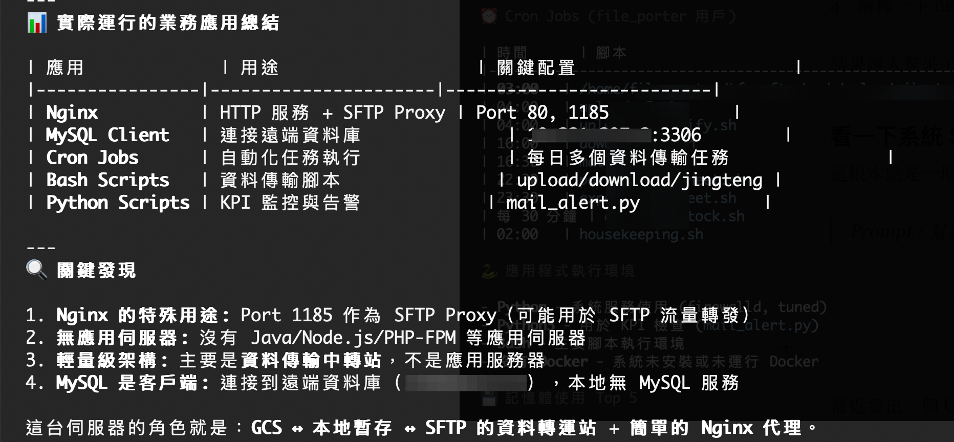 這次用 Claude Code 做 Linux 系統管理,最大的感受就是角色轉換 。以前遇到老舊系統,要嘛找老員工問(如果還在的話),要嘛自己土法煉鋼一個指令一個指令試,通常要花一段時間才能搞清楚狀況,更別說寫出能用的 monitor script。