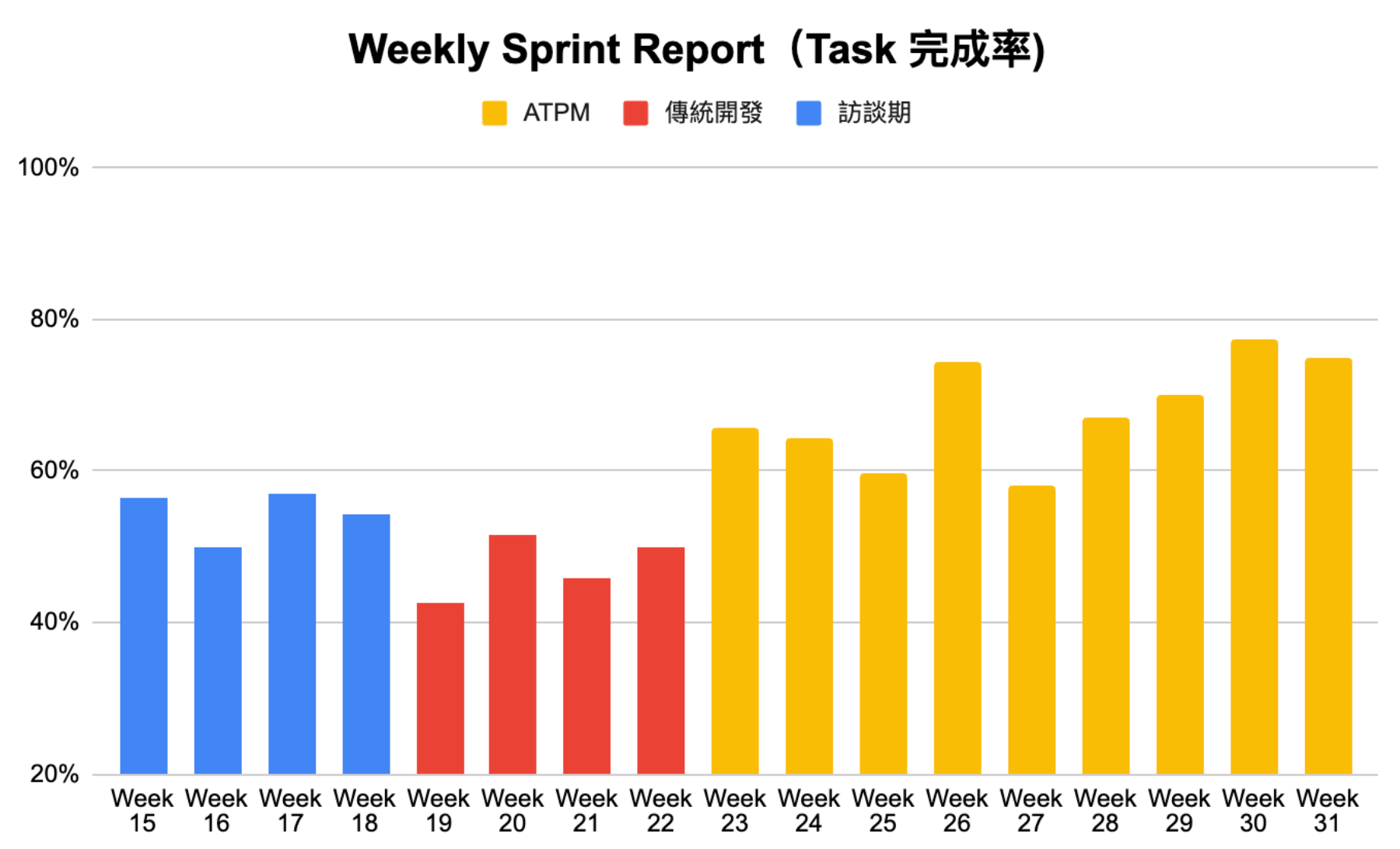 也因為如此,其實我們一開始在做這個帳務系統時,反而用傳統的流程跑,而非新的 PRD 為主的 開發。當一切入開發期(紅色的 bar) ,我們就陷入經驗不足的混亂,在下面 Week 19 ~ Week 22, 一直在泥沼內。當下其實我已經發現大家雖然都很 Jr , 但是已經有一定開發的範式了。(所以人的經驗牆是很容易出現的)