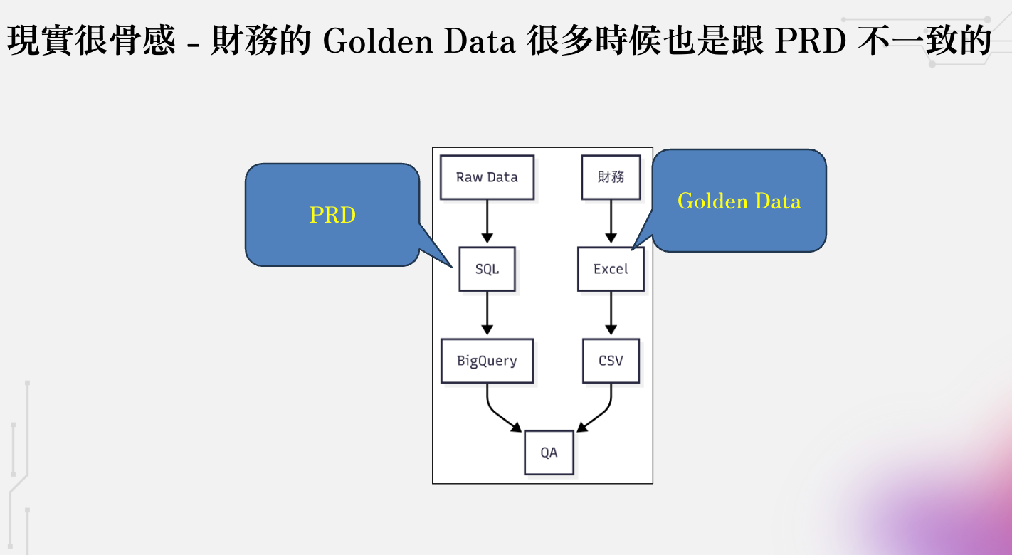 就算剛剛講那麼多,到最後我們依舊還是一半 AI 自動QA,一半場景手工。原因很簡單,在我們的場景下,不只是 PRD 可能不是最新,甚至連 PROD 舊數據(我們稱之為 Golden Data)都可能不是最新的。