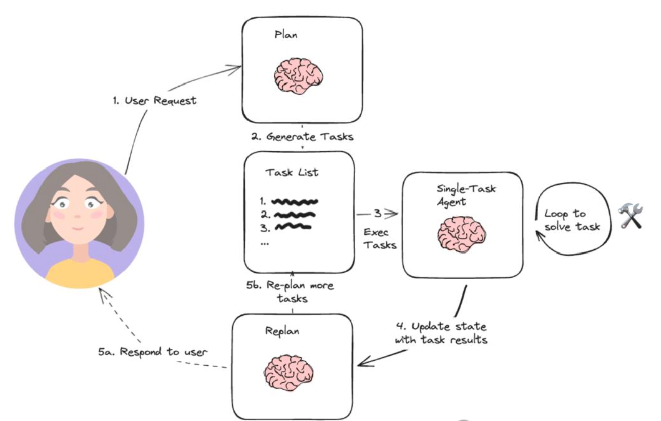 Plan & Exec 更適合是「旅遊規劃」聊天機器人,或是 Coding Agent,用戶說需求到模型規劃整個對話路線(確認問題到查詢方案到提供建議到執行決策)到逐步引導用戶走完流程。缺點就是首個回應慢(需要較長規劃時間)。