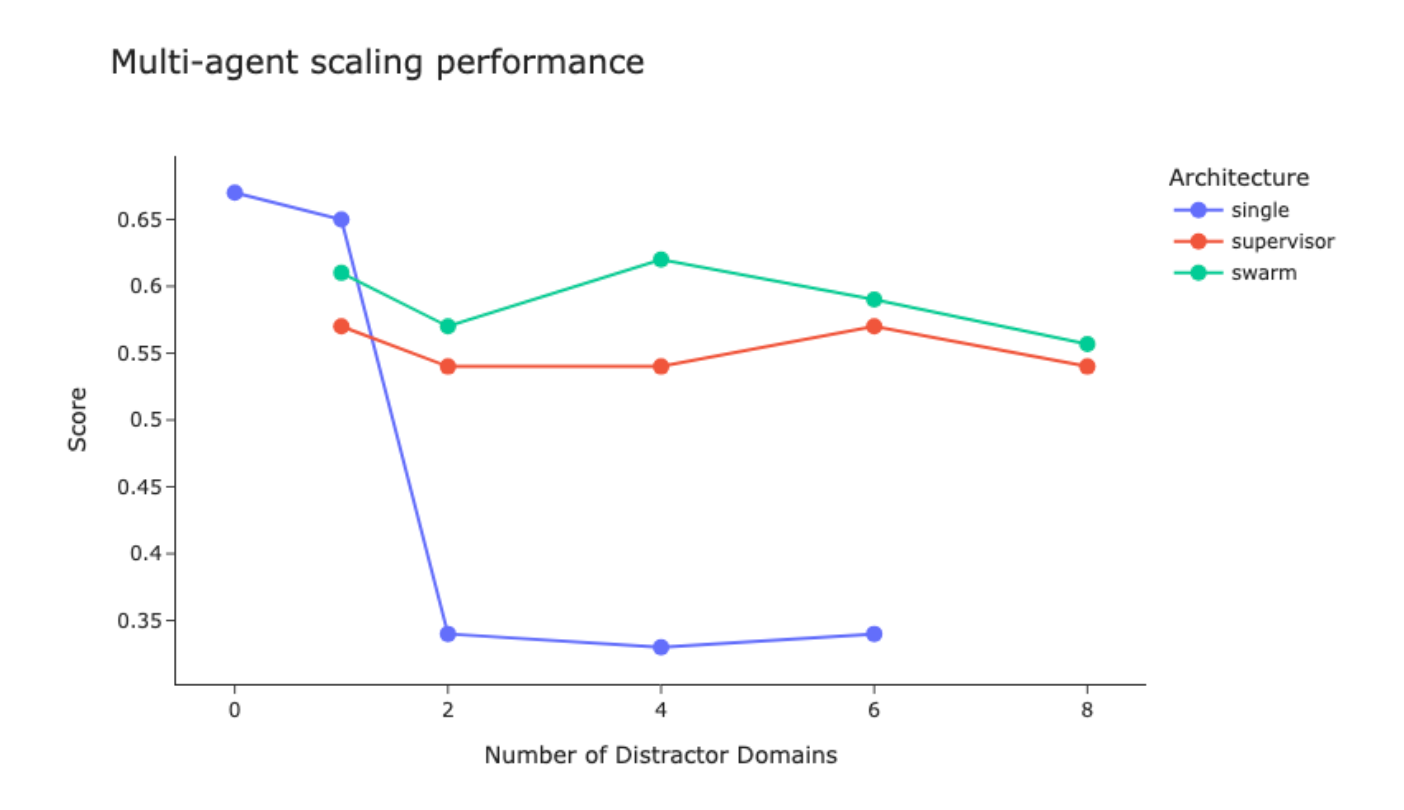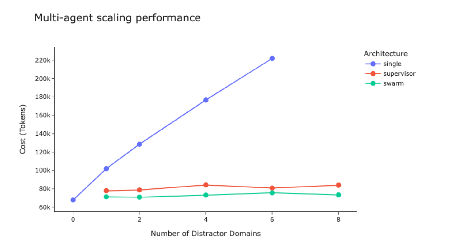 LangChain 做了一個 Benchmark , 他發現當越多不同領域的知識丟進來同一個 Workload ,Single Agent 的效率就明顯的下降,但是multi agent 卻可以保持一個較佳的 performance
