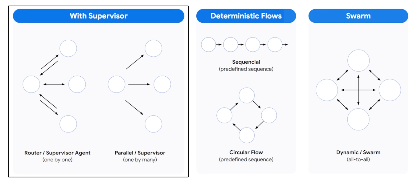 Supervisor : 有點像是人的組織,有一個管理者,跟工作者。如果用管理團隊來舉例,經理就是 Supervisor ,下面有 EngA , EngB , EngC … Agent 進行協作。剛剛舉的健康檢查醫療團比較像是這個,有很多科室進行會診,但是最後有一個 coordinator 主治醫生來做最後判斷。