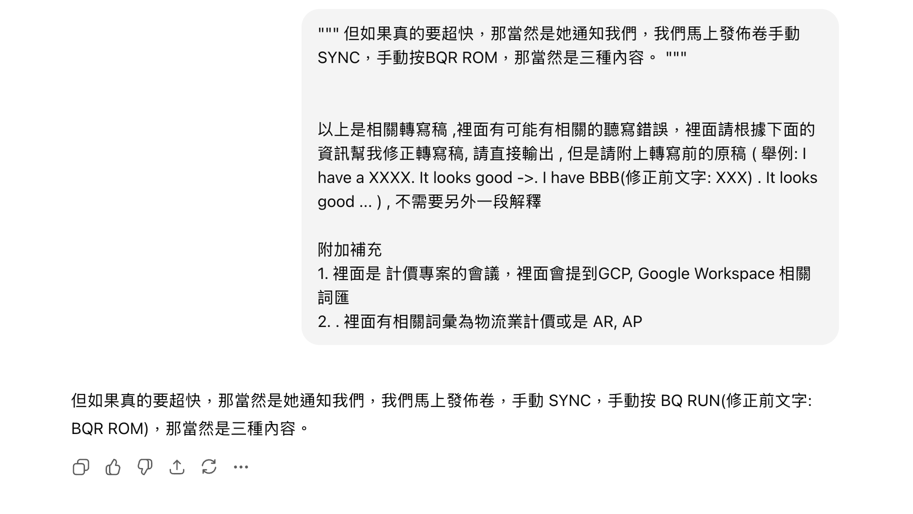 這樣就可以做到比較適合的轉寫,並且保留原文確保 AI 搞錯